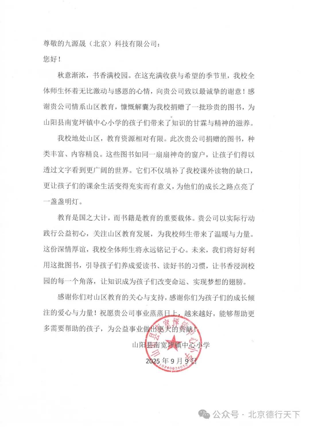 2025年8月6日,九源晟(北京)科技技术有限公司全体成员通过“一本书的远行”公益活动,向陕西省商洛市山阳县南宽坪镇中心小学捐赠500本图书,助力学校图书馆建设。这是“一本书的远行”建设的第22个图书馆。