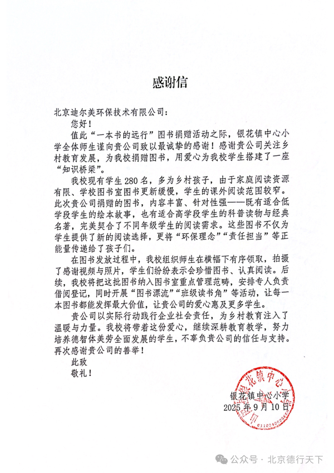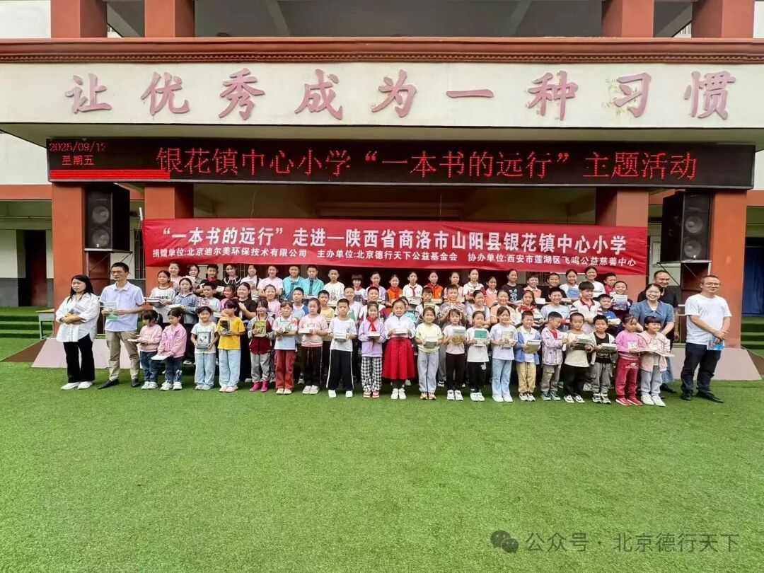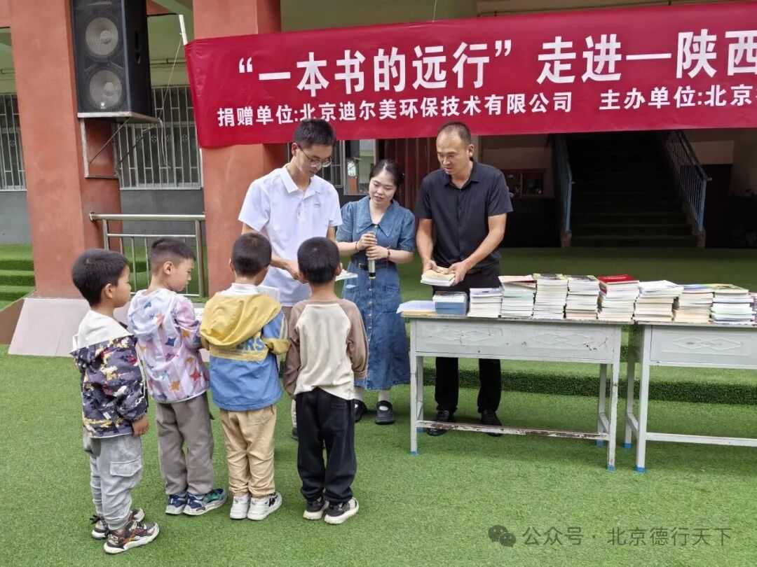 2025年8月6日,北京迪尔美环保技术有限公司全体成员通过“一本书的远行”公益活动,向陕西省银花镇中心小学捐赠500本图书,助力学校图书馆建设。这是“一本书的远行”建设的第23个图书馆。