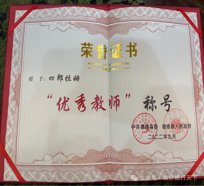 她的付出被看见、被珍视——中共德格县委、德格县人民政府授予她“优秀教师”称号。这份荣誉,是对她十三载春秋默默耕耘的最好见证。
