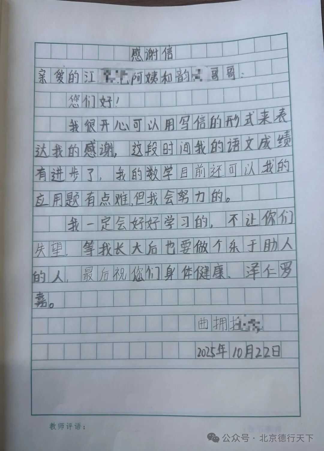 除了学业进步,更让人欣慰的是孩子们心态的转变。有学生在信中说“以前总担心买不起辅导资料,现在有了叔叔阿姨的支持,我终于能安心刷题了”;还有孩子主动帮同桌讲题,把“爱心传递”的种子种进了心里。这些细微的变化,正是助学项目最珍贵的收获。