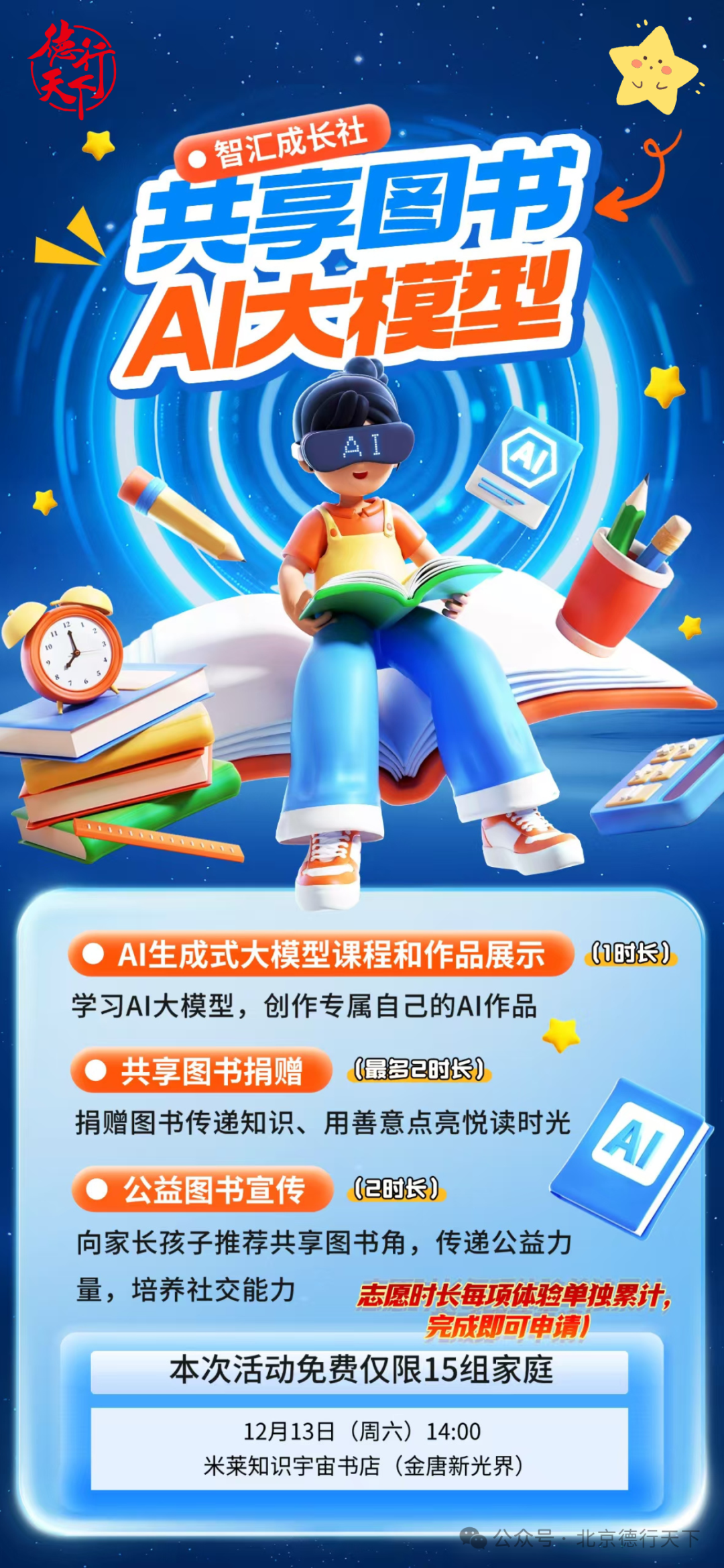 AI动画魔法师+共享图书公益活动开始了,三重体验可选择:学习实践生成式大模型课程、为公益站台传递善意、以书会友分享温暖,欢迎大家的参与。