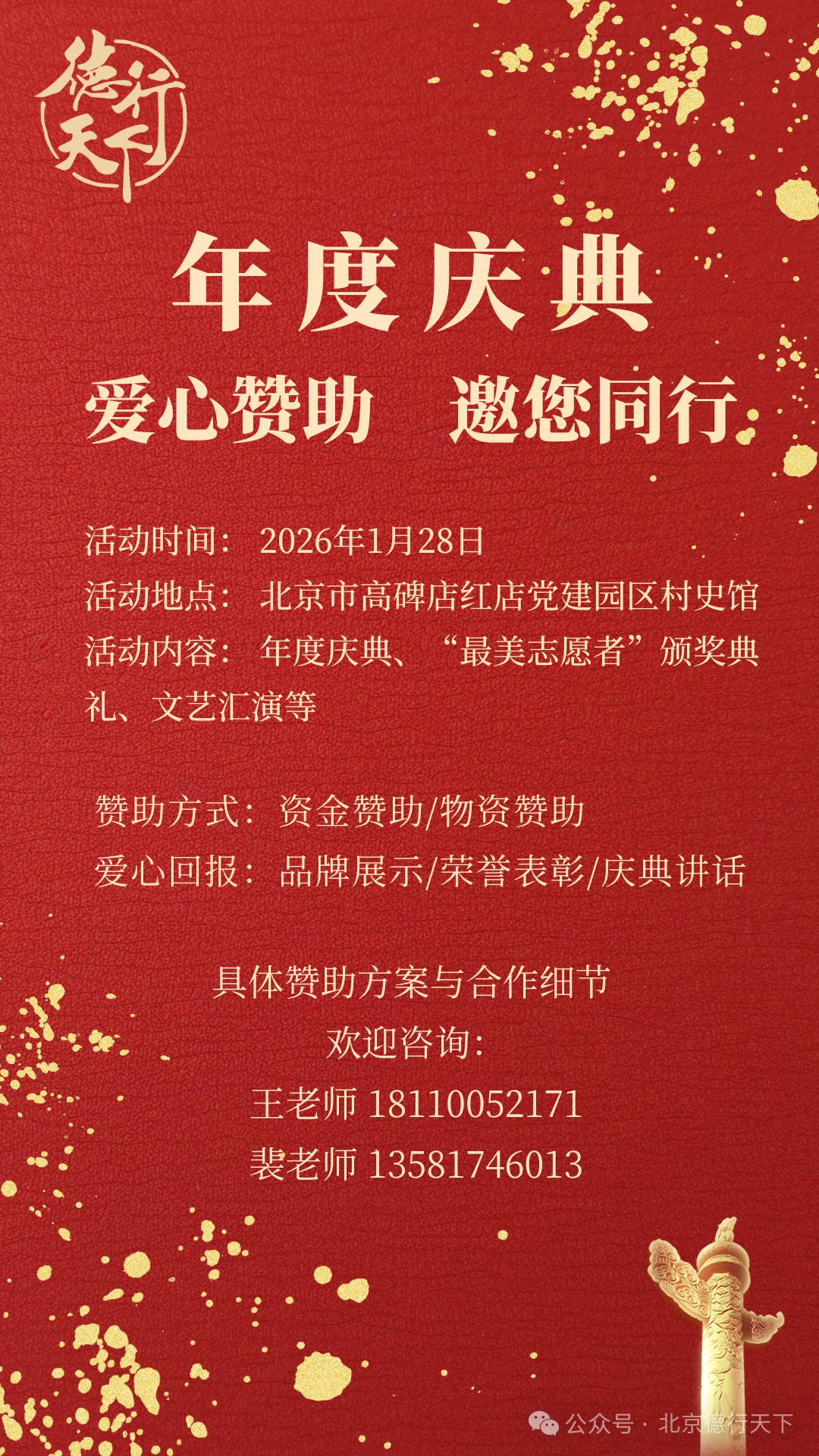 北京德行天下公益基金会将于年底举办2025年年度庆典及“九源晟杯”最美志愿者颁奖典礼,为确保活动顺利开展,提升活动影响力,现面向社会各界爱心企业和爱心个人招募赞助。您的慷慨支持将为公益事业注入强大动力,同时我们也为您提供多样化的合作回报方式。