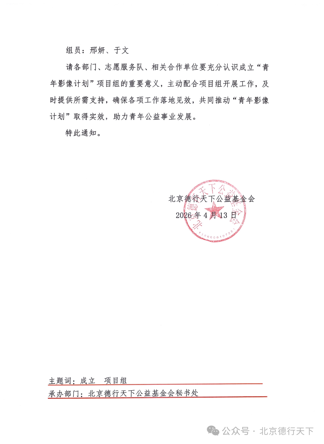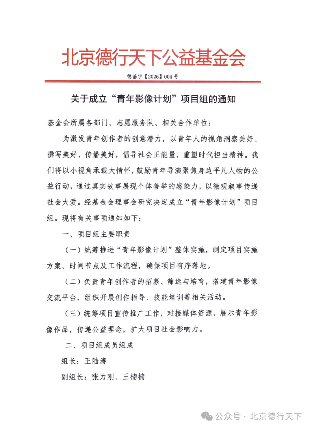 近日,为激发青年创作者的创意潜力,以小视角承载大情怀,北京德行天下公益基金会正式成立“青年影像计划”项目组。