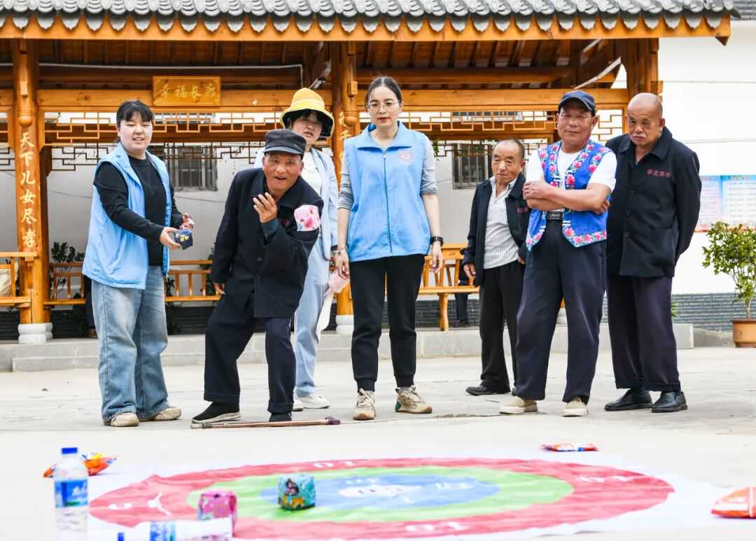 ▲云南省牟定县乐心社会工作服务中心联合银发志愿服务队,为全县7个乡镇敬老院的老人开展关爱服务。图为社工在江坡敬老院和老人一起玩丢沙包游戏。(供图/段绍东)