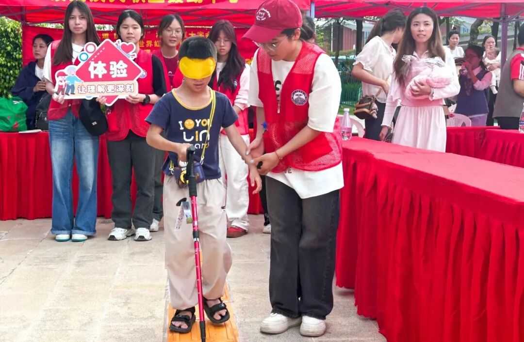 ▲福建省厦门市集美区灌口镇“五社联动”项目社工联合开展助残公益活动。图为一名儿童体验盲道模拟场景,亲身感受残障群体面临的生活挑战。(供图/黄春梅)
