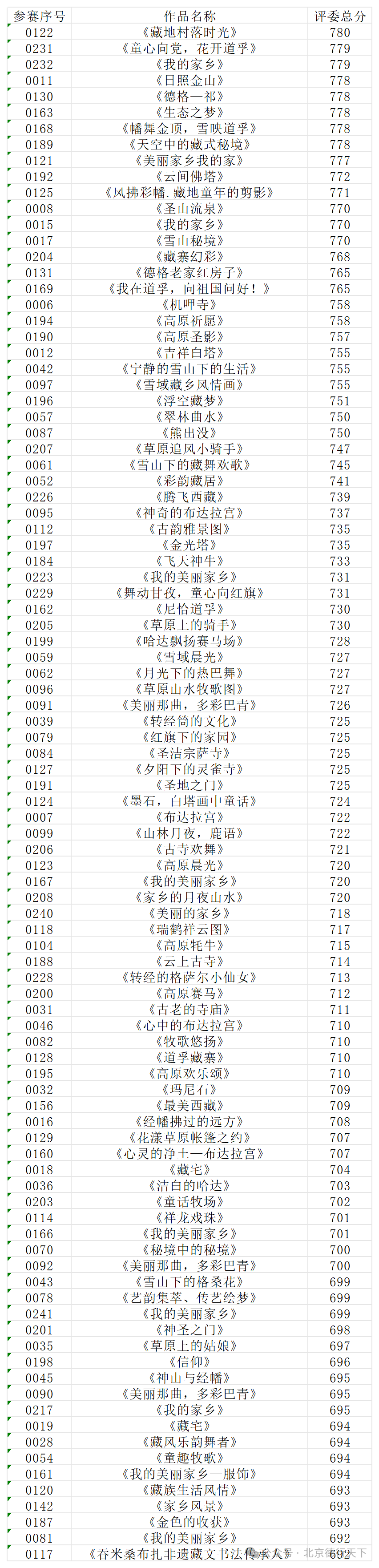 在众多参赛者的热情参与和社会各界广泛关注下,第九届“我的美丽家乡”藏区儿童绘画比赛已圆满完成专家评委打分阶段和网络评选环节!现正式进入放榜公布环节!